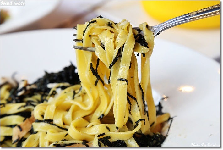 Daphne 很喜歡吃寬麵,覺得寬麵吃起來較有收更多醬汁的感覺,不過有賣寬麵的店家不多,能在鬍子叔叔 吃到寬麵太開心了,這裡提供原味細麵、墨魚細麵、波菜寬麵、南瓜寬麵。這次選擇把香蒜雞肉海苔麵搭配南瓜寬麵。