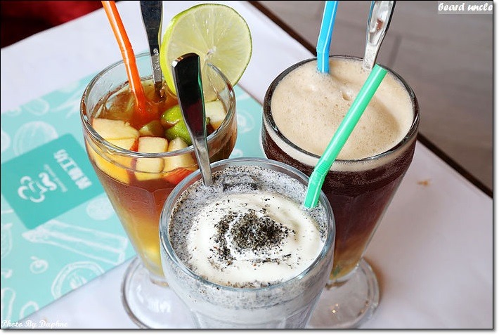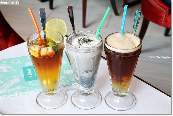 水果茶是三種飲料中味道相對淡,甜度最低,加了蘋果果肉與金桔檸檬,點排餐時適合點來去油解膩,香柚茶加入柚醬的原汁原味,慢飲中飲出甘酸的好比例,奶凍是最有意思的飲品,可以邊喝邊吃!加了整塊甜而不膩的奶凍下去,雙重濃郁的襲擊下,滑口的感覺源源不絕又喝的到芝麻顆粒,芝麻下的量夠多,不過抓的量剛好,過多就會太甜。