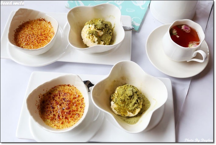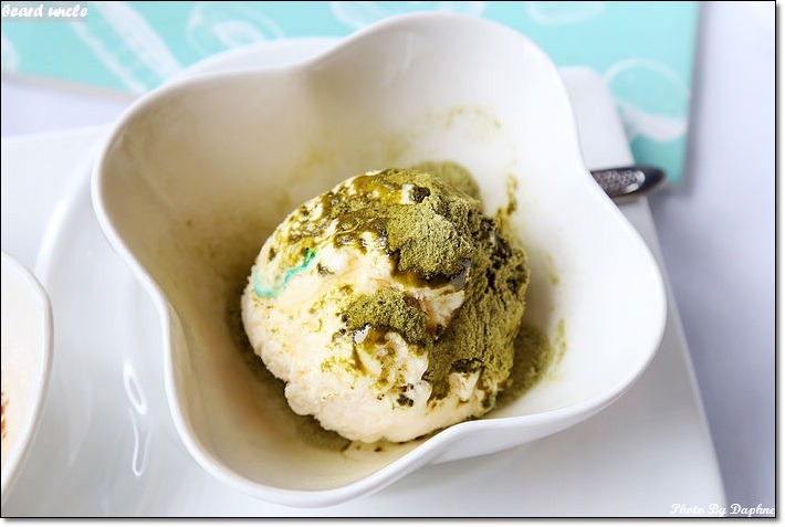 香草冰淇淋被灑上鮮綠色澤抹茶粉,茶香撲鼻,與香草冰淇淋一同吃進嘴裡,香味宜人輕柔,冰淇淋爽滑黏口。