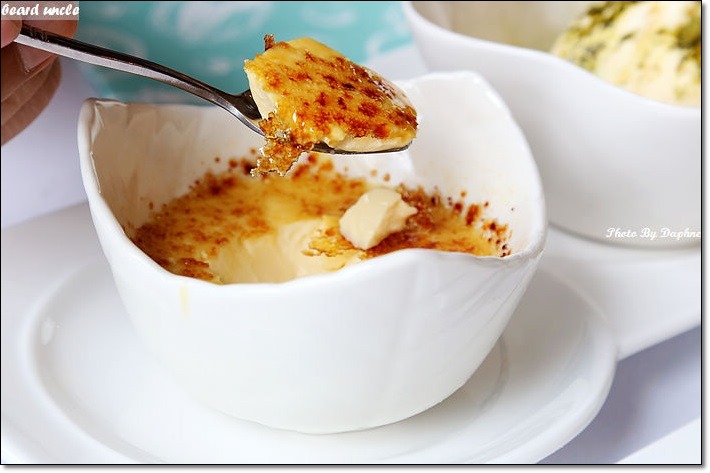 焦糖脆片酥脆微苦,焦糖下的餡軟柔嫩,以湯匙輕敲後露出,舀起一匙覆著焦糖脆片的布蕾,蛋香、奶香加深法式烤布蕾的綿密濃郁。