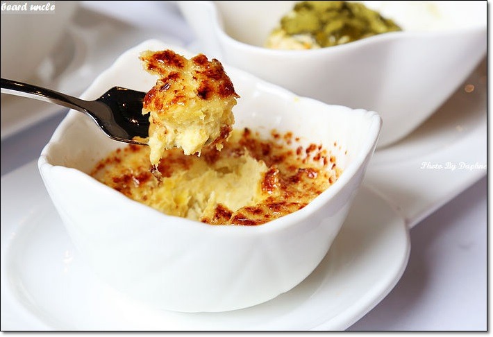 如果不用湯匙挖,焦糖蜜地瓜看起來跟法式烤布蕾完全一樣,焦糖蜜地瓜把製作法式烤布蕾的做法,同樣覆蓋上焦糖脆片。蜜地瓜有漂亮的金黃色,加了鮮奶與地瓜打發,處理得鬆綿纖細,吃起來就真如品質好的地瓜般甜又香還帶有水份,與柔和的奶香。