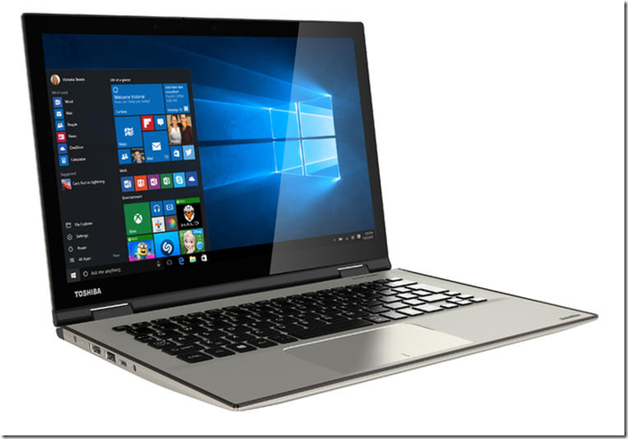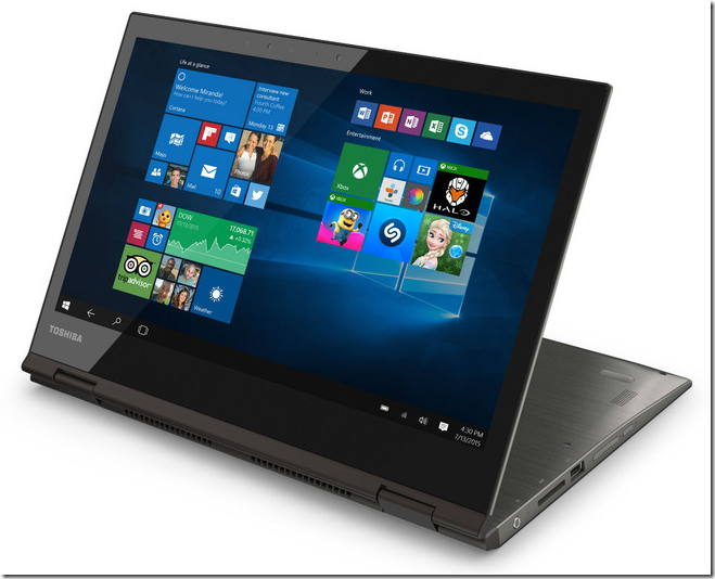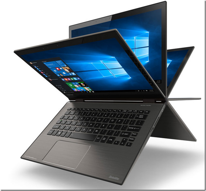 Toshiba Satellite Radius 系列筆電與 Lenovo Yoga 系列,在軸承設計很相似,可以讓螢幕 360 度的翻轉,所以要正常筆電使用或是站立成影片觀賞模式,或是成為平板模式都可自由發揮應用。