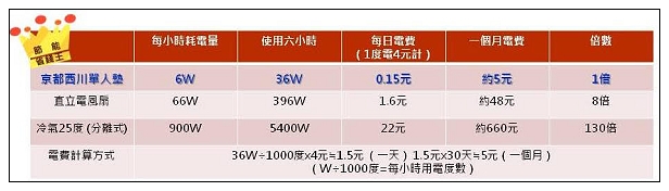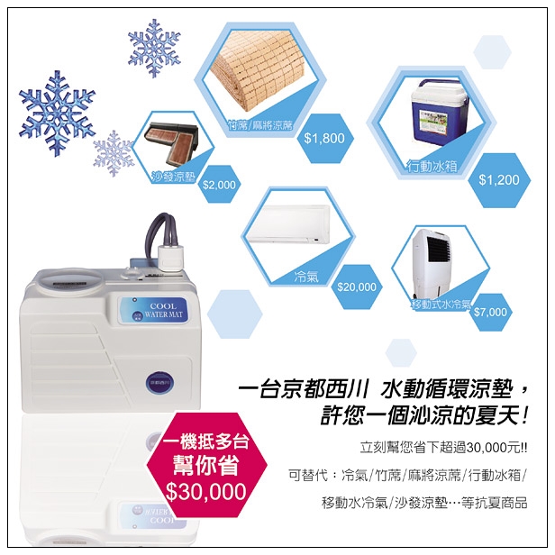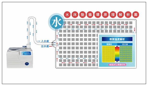 這款產品最大的特點就在它利用水動冷循環的原理,保持涼墊的低溫效果,在以往小時候也用過類似的產品,像是竹席、麻蓆或是散熱墊等等,但都沒有像這款產品以循環的方式來做保冷作用。重點是,它跟一般家用直立電風扇或分離式25度冷氣相比較,相當適合精打細算的族群,一個月下來可省近三萬元左右!