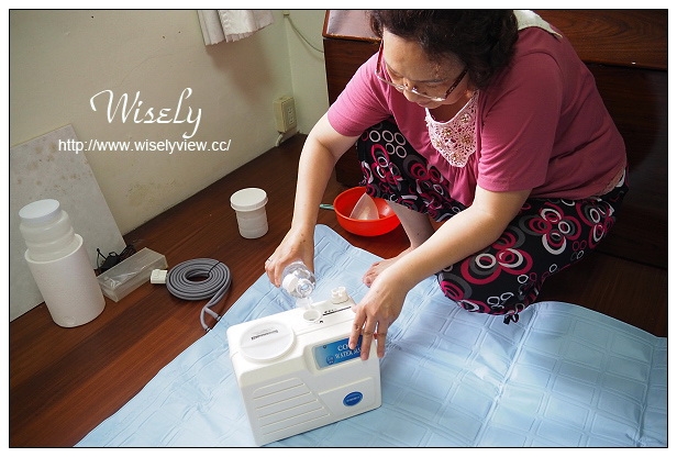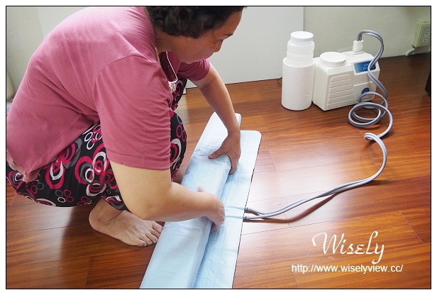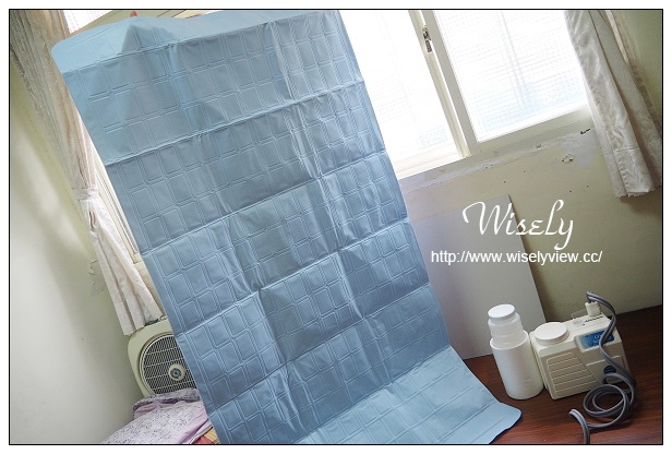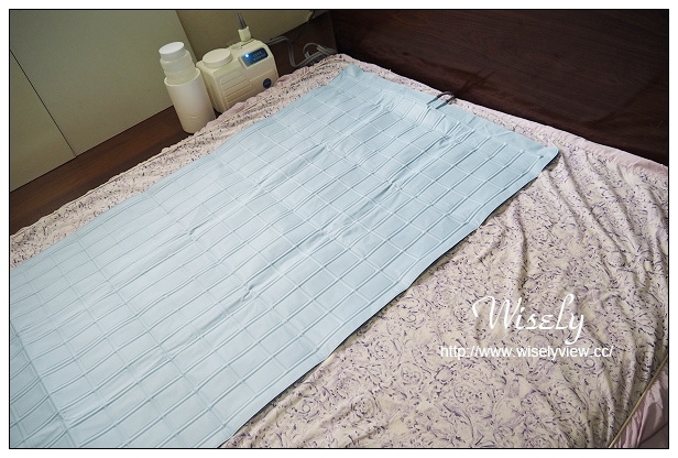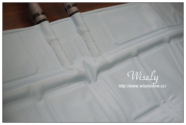 開啟電源之後,主機開始運作然後將冷水帶入到床墊裡,而墊子上會有明顯鼓充水的樣子便算是成功使用了。Wisely這張為單人加大版本,整張床墊充滿的時間大概10~15分鐘左右,為了舒適睡眠另外在底部又加了個軟墊使用。