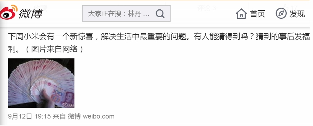 小米品牌市場總監徐洁云在 12 日於微博上發出一則預告,表示下周小米將會發佈一個新的驚喜,來解決生活中最重要的問題。雖說要請大家猜一猜,然而隨之一同亮相的圖片卻也真的是大家覺得最重要的問題: 錢!!!