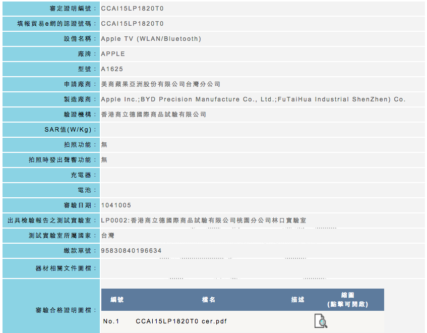 而根據 NCC 的查詢資料,在 10 月 5 日的時候有一款 Apple TV 型號 A1625 的產品通過審核,再經過進一步的查詢發現 A1625 也就是第四代 Apple TV 的型號,看來下週新一代 Apple TV 開放預購,台灣的朋友就算沒有跟到,但也很有機會可以很快的就入手了喲!不過當時發表會的售價為 32GB USD149 (約 NT$4,880)/ 64GB USD199 (約 NT$6,515),不知道到時開賣後公佈的價格又會是多少呢?!