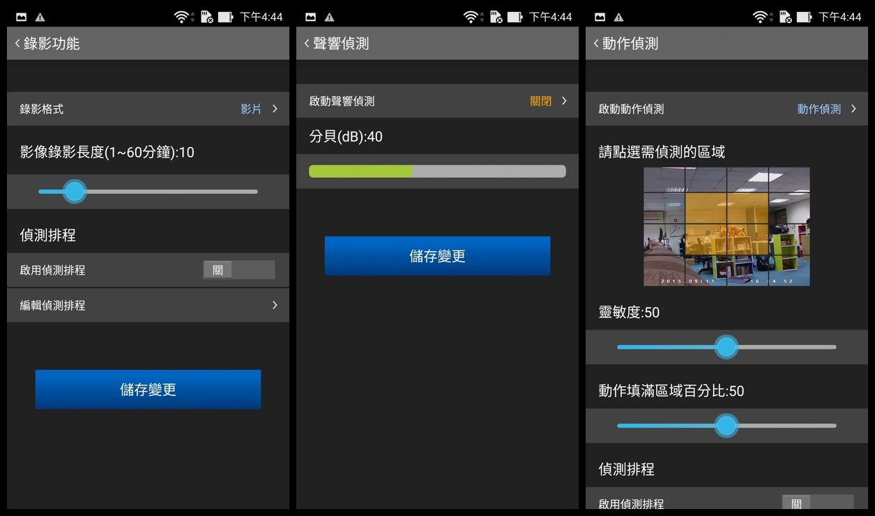 除了可以設定錄影的時間和排程外,我們還能進行相關偵測,像是聲響偵測可以設定多少分貝來啟動,動作的部份可以看偵測的區域並調整靈敏度,對於防盜或小朋友狀況的感測相當好用。
