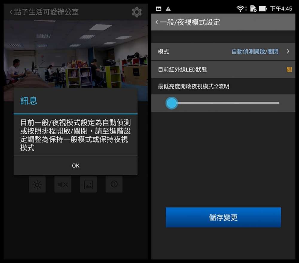 AiCam 在夜視模式也可以進行設定自動偵測以及紅外線和流明的調整。