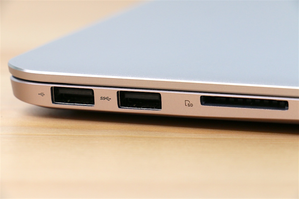 接下來看一下 UX305LA 的相關連接埠。機身左側從左到右分別是 USB 2.0、USB 3.0、SD 卡槽。