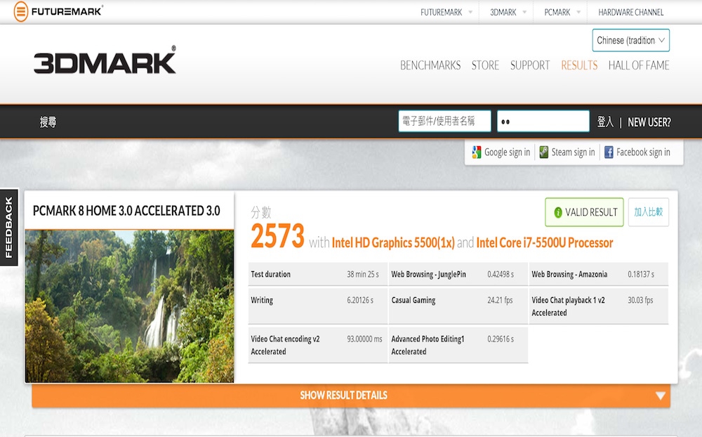 從 PCMARK 的各項模式,就可以掌握到文書處理等相關實際的應用測試,Intel 第五代 i7-5500U 的處理器真的幫 UX305L 加分許多,文書處理方面就非常夠用了,網頁的瀏覽、文件處理、串流影音都有不錯的表現。