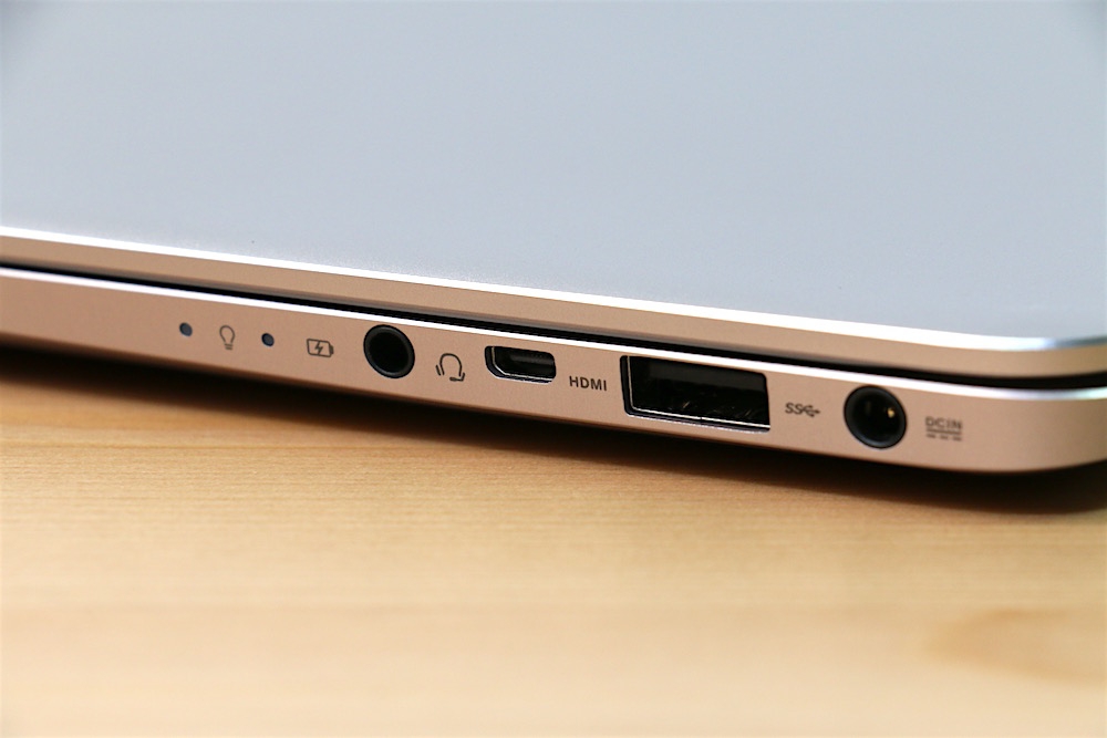 機身右側從右到左分別電源輸入孔、USB 3.0、micro HDMI 端子、音源孔以及電源與訊息提示燈。