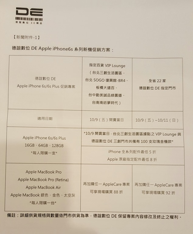另外在 10/9 ~ 10/11 於全台德誼數位購買 iPhone 6s 系列新機,可享 iPhone 配件最低 5 折起、Apple 原廠指定配件 8 折起優惠,另外搭配 AppleCare 加購 MacBook,可享 MacBook 92 折優惠。