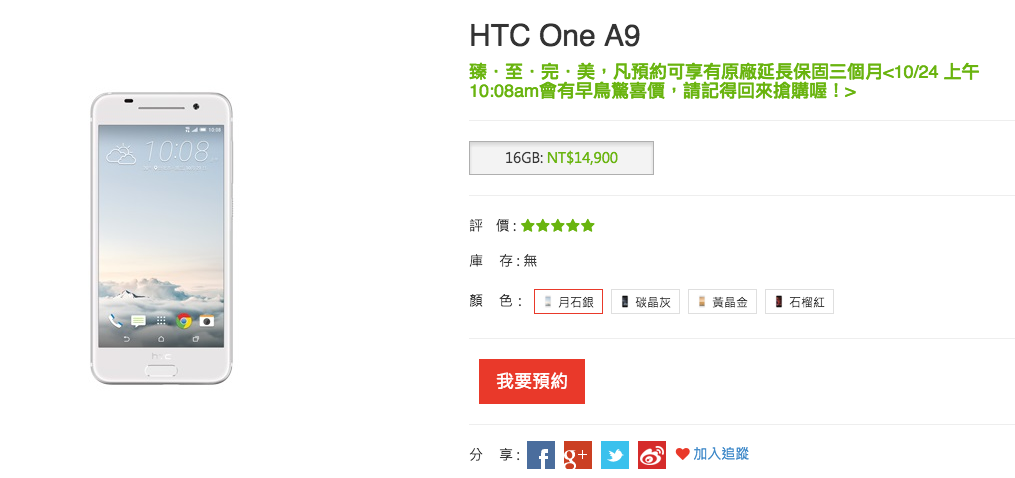 經過了昨晚相當特別的 A9 發表會後,終於快要等到下午實機亮相的時刻! 這次 HTC one A9 除了採用較薄的利落設計,並推出相當符合秋冬色調的銀白、灰黑、金與紅四色。但令人驚喜的是,早在發表會前幾小時, HTC 便在官網公布 2GB RAM/16GB ROM 版本售價為 NT$14,900。