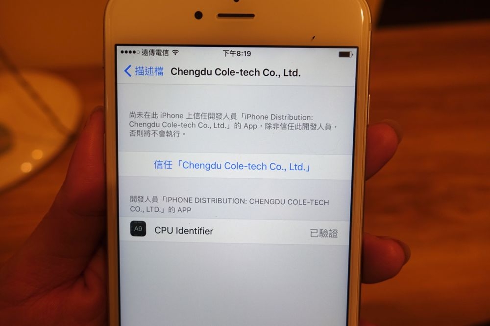 開放完信任權限後,回到桌面上 CPU Identifier 的 icon 按下去,便會為你揭曉!!! 若是看到 S8000 Samsung 就是三星, S8003 TSMC 就是台積電!