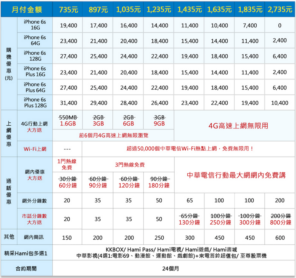 中華電信推出了相當多種 iPhone 6s / iPhone 6s Plus 購機費率,有精彩 Hami 包、4G 極速方案、新 4G 學生方案,精彩 Hami 包月付 2735 元(24個月)就可免費帶回 iPhone 6s 16GB,而 4G 極速方案月付 2636 元(30個月)就可免費將 iPhone 6s 16GB 或 64GB 帶回家。另外,中華電信推出新 4G 學生方案,讓學生用戶首年與次年月租費進行調降,上網內容也推出前半年 4G 上網吃到飽,半年後上網容量為原合約兩倍多的優惠服務,詳情請上中華電信官網查詢。
