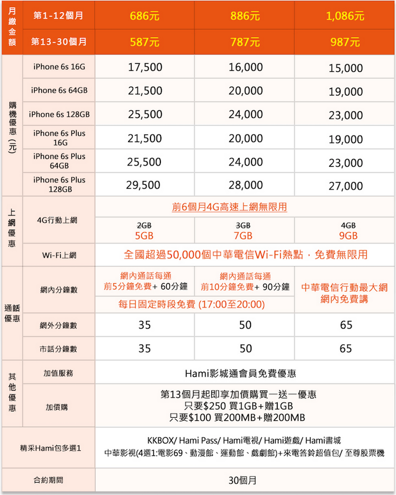 中華電信 iPhone 6s / iPhone 6s Plus 費率方案