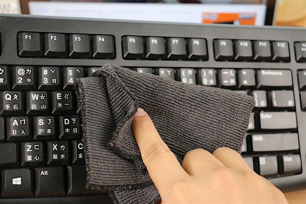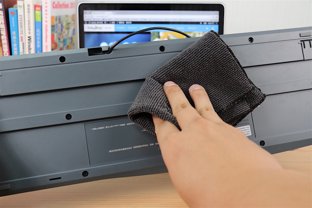清潔方式相當簡單,只要使用擦拭布來回在鍵盤上作擦拭,就能完成鍵帽表面灰塵及食物碎屑清潔,若鍵帽上面有殘留許久的頑垢,可以稍微沾點水來做擦拭,再沒辦法擦拭掉,可以使用少許的清潔劑加上清水做擦拭。