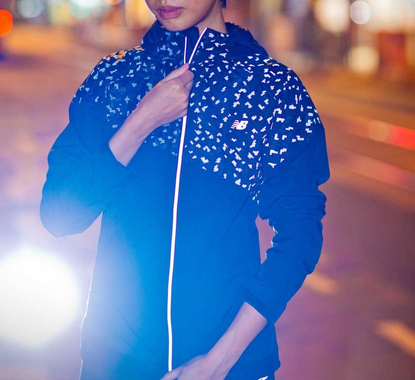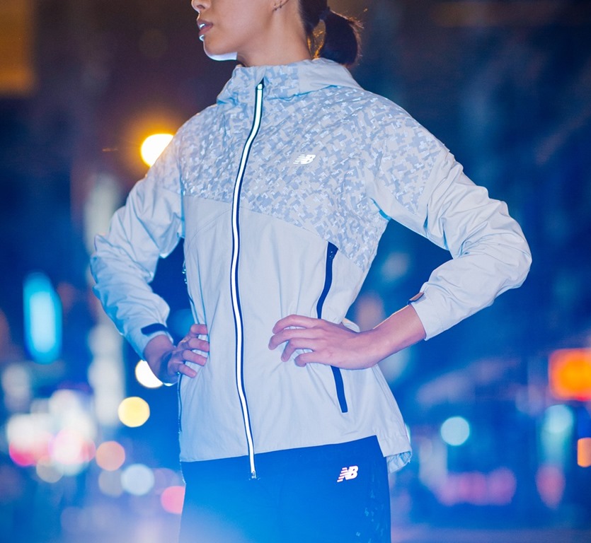 New Balance專業慢跑服飾系列本季加入夜間反光元素,以城市剪影幾何圖案點綴於沉穩黑底,反光印花連帽風衣外套除布面反光圖樣外,更運用於連帽與拉鍊上,不只時尚同時加強夜間運動安全,袖口可調黏扣帶防止跑步時寒風竄入,專為秋冬氣候設計的防潑水材質,無論遇風遇雨都能夠盡情享受慢跑樂趣;反光印花緊身長褲採緹花鬆緊腰帶增加運動時的舒適度,隱形式口袋設計收納更方便。