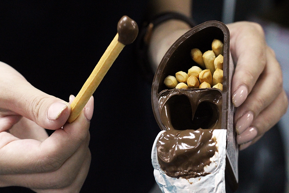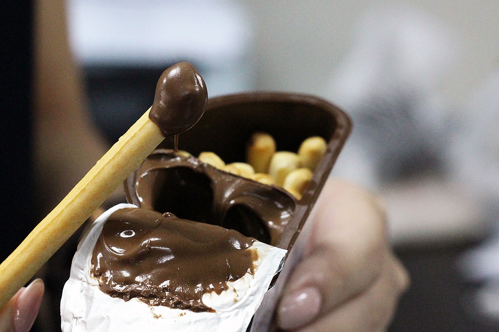 杯子一邊是榛果可可醬,另一邊則是麥芽麵包棒,這兩個一定要搭配一起吃才歡樂!主角榛果可可醬的味道很香、很濃郁,互補的配角麥芽麵包棒就走樸實風格,同樣是香脆可口,真的會一口接一口啊!
