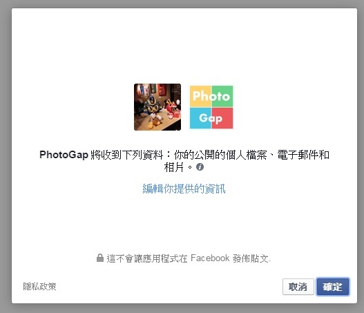 接著會詢問你是否願意讓 Photogap 取得你的資料,按下確定。