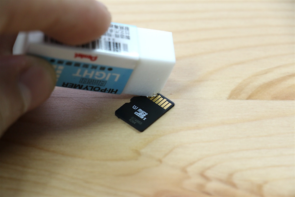 接著,只要將記憶卡金手指部分朝上,再使用橡皮擦輕輕的在金手指上來回擦拭,就能輕鬆地將金手指上的髒污徹底的清潔乾淨。