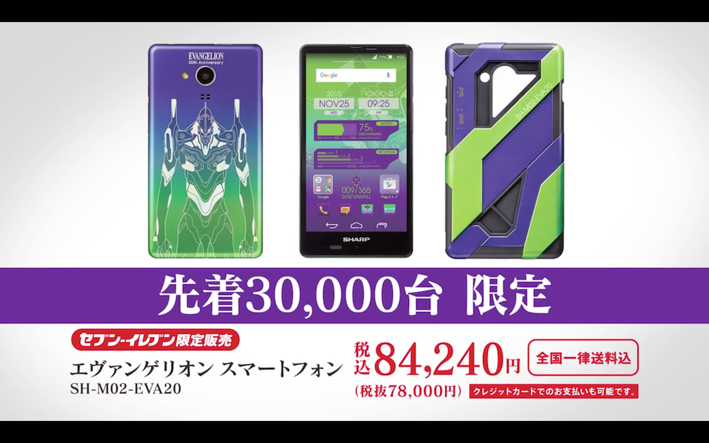 Evangelion 20th Anniversary 20 週年紀念機限量 30000 支,SIM FREE 版本 ( 無鎖版 ) 售價為 84,240 日幣,折合台幣大約 NT$22,770,欲購買的消費者需要到日本 7-11 申請購買,前 5000 支預計在今年 12 月出貨,之後的 25000 支預計要等到 2016 年 4 月左右才會出貨,想購買的 EVA 迷可不容錯過。