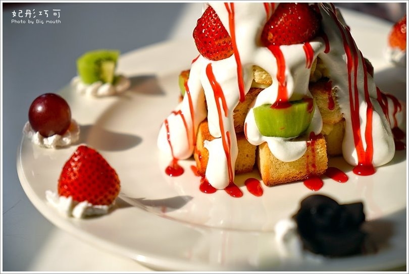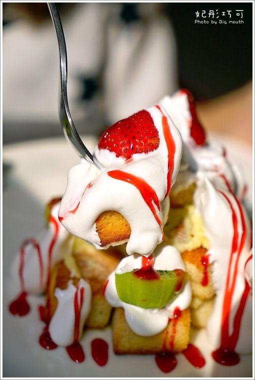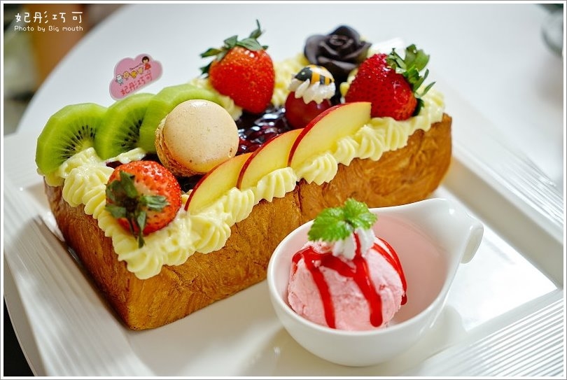 ▼裡頭一顆顆一口大小的香酥吐司塊,搭配多種水果、香草冰淇淋、卡士達醬、現打鮮奶油與草莓醬,看起來就好像一個藝術品,讓口咩整個超捨不得動它的啦!