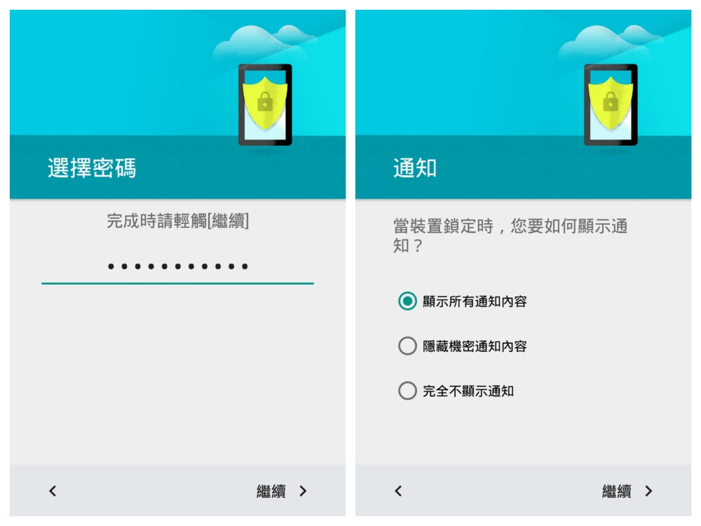 密碼設定完成後,系統會要求使用者再次輸入密碼以作確認,接著系統會詢問是否將收到的通知或是訊息做隱藏,確保手機資料不會被他人看到。