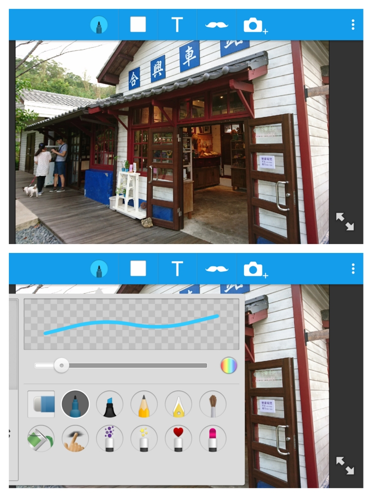 將照片新增至繪圖 APP 後,上面會出現可以選擇的繪圖工具,種類相當多,喜歡在照片上增添一些可愛、有趣元素的朋友可以逐一試試。此外,還能調整各種畫筆粗細、顏色、圖案,種類相當豐富。