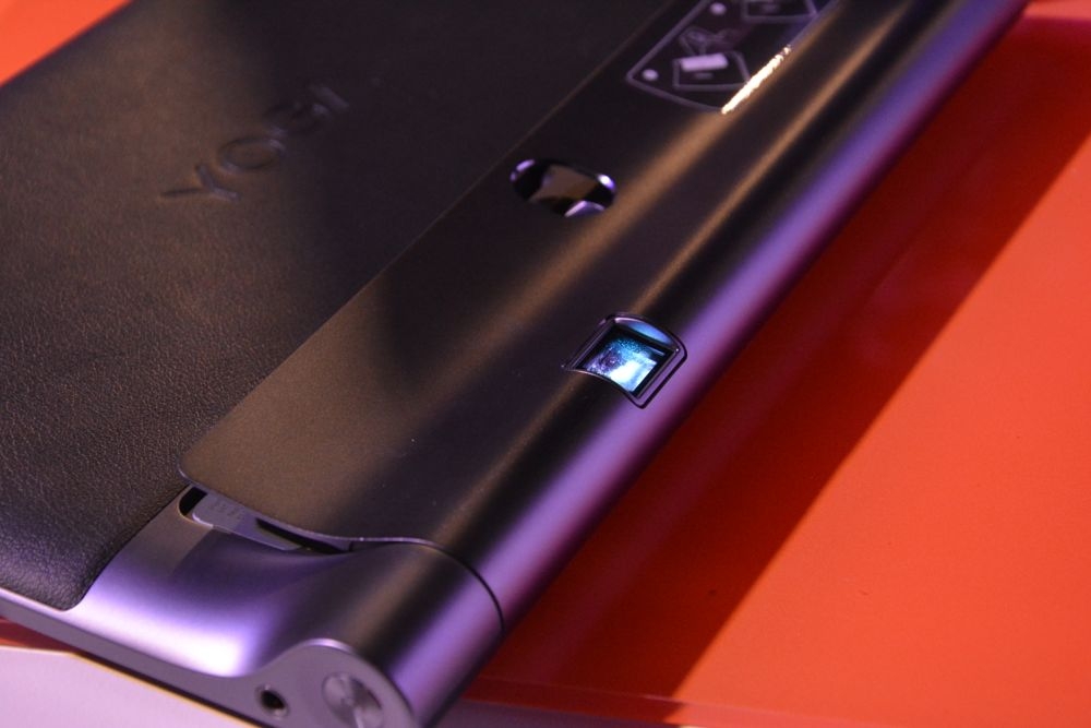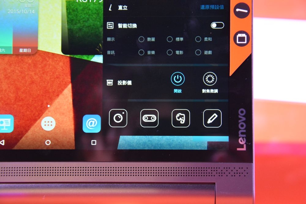 而 Yoga Tab 3 pro 最大的特色就是後面支架所內建的投影鏡頭,可以讓使用者將 Tab 3 pro 中的桌面投映到牆上與所有人一同分享。