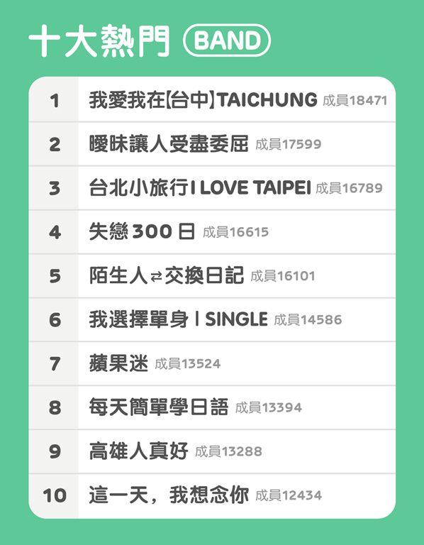 Camp Mobile 台灣總經理邱彥錡表示:「為了讓觀眾了解 BAND 主題的豐富性,我們打破以往廣告操作的模式,特別拍了四支不同劇情的廣告,鎖定不同族群,引起更多的共鳴。」目前 BAND 上已經有超過 3 萬個公開社群,熱門的群組包括情感交流的「失戀 300 日」、「曖昧讓人受盡委屈」,興趣嗜好群組「蘋果迷」、,以及地方性社團「台北小旅行」等