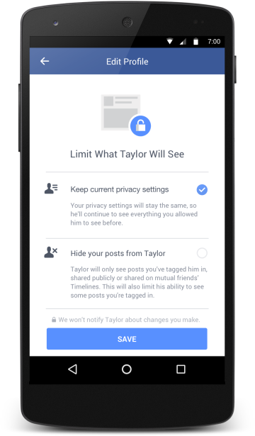 相較於剛剛看到他 PO 了什麼,這功能是讓你選擇要不要給他看到你分享的東西。你可以保留目前一樣的權限,也可以讓他只看到你公開或是 tag 他的文章。