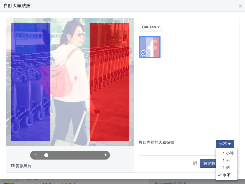 只要進入 Facebook 的官方粉絲頁,便會發現至頂文有著請你 “立即試用” 的套用法國國旗濾鏡的活動。在其中你可以選擇想要套用的濾鏡與更換時間。