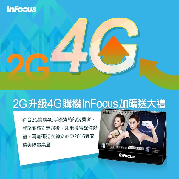 此外,為響應政府日前提出的「補助2G換購4G手機」措施,InFocus(富可視)決定推出好禮再加碼!只要符合2G升級換購4G手機的消費者,至官網登錄資料,就送獨家配件好禮,還有安心亞2016年精美桌曆! (活動網址:http://goo.gl/dJQKMJ)