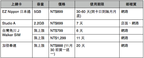 現在越來越普遍的上網卡其實就是使用一張 SIM 卡來進行,目前市面上較為普遍的共有這四家上網卡,其中 EZ Nippon 主打 5GB 可以使用最多 60 天在推出便引起一陣迴響; Studio A 雖然有著 2.2GB 容量的限制,但其實超過並不會因此不能使用,只是會做降速的限制,並且由於實體店面的分佈優勢,讓消費者在購買上相對的容易與具有機動性。