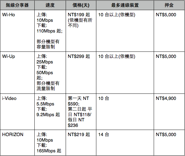 簡單整理目前 WiFi 分享器的幾個主要品牌,要注意的是像 Wi-Ho、Wi-Up 1等較為知名的分享器品牌都有著多款不同依照地區、電信等特色主打的分享器型號,使用者可以依照自己前往地區與用量需求來做挑選; 有部分幾型或品牌都有著無上限的用量提供,若是多人使用的話,用量部分也多注意一下,以免不小心玩一個直播就超過用量上限而被降速還搞不清楚狀況造成誤會。