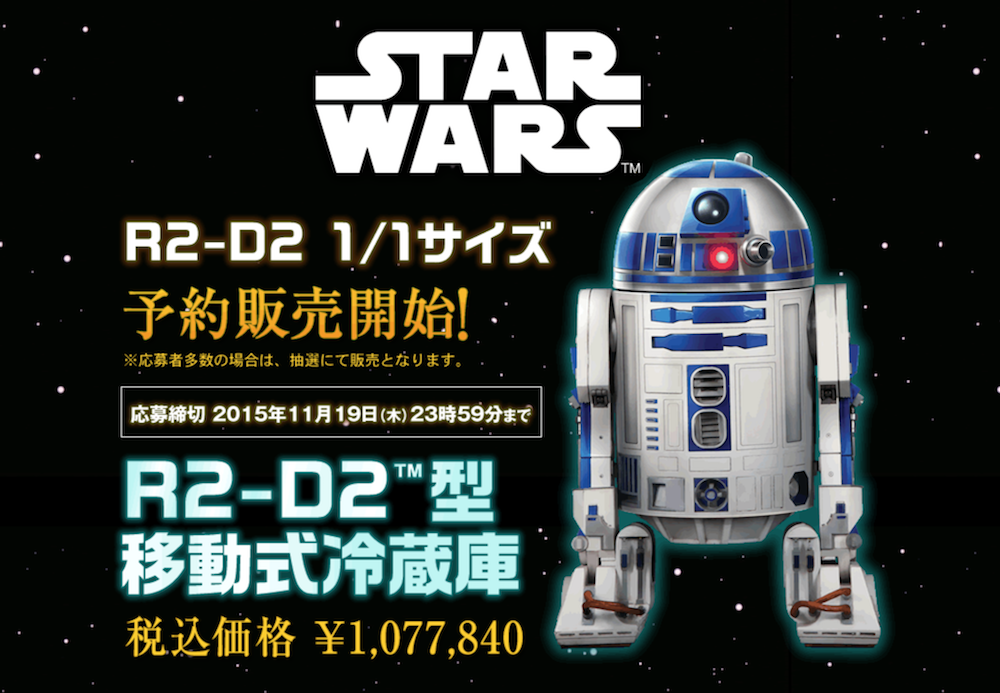 R2-D2 預計 2016 年 1 月 1 日開始發售,目前已開始預約登記,售價為 1,077,840 日幣,則合台幣要價 30 多萬元,想要購買的星戰迷可要有荷包大失血的心理準備。