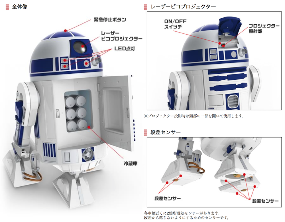 R2-D2 的冷藏庫最多能放入 6 瓶罐裝飲料,除此之外,R2-D2 的身上也有許多有趣的配備,比方說頭上有 LED 燈、還有緊急停止按鈕,最特別的是 R2-D2 的頭能夠旋轉,讓 R2-D2 更接近電影中的所有動作。