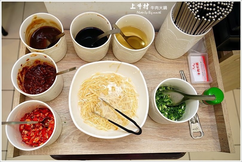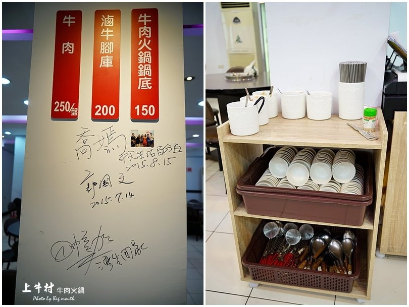 ▼菜單簡單寫在牆上,就只有鍋底、滷牛腳庫、牛肉等三種,之後還會推出熱炒等牛肉相關料理,讓人好期待啊!這裡的餐具、醬料是採用自取的方式,要用多少拿多少,一整個很方便唷!
