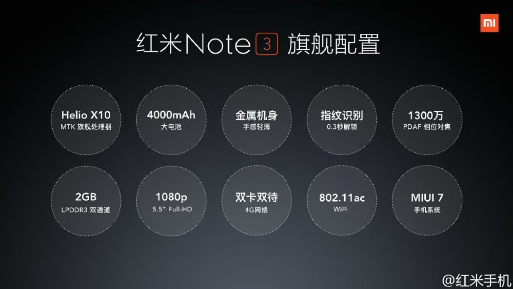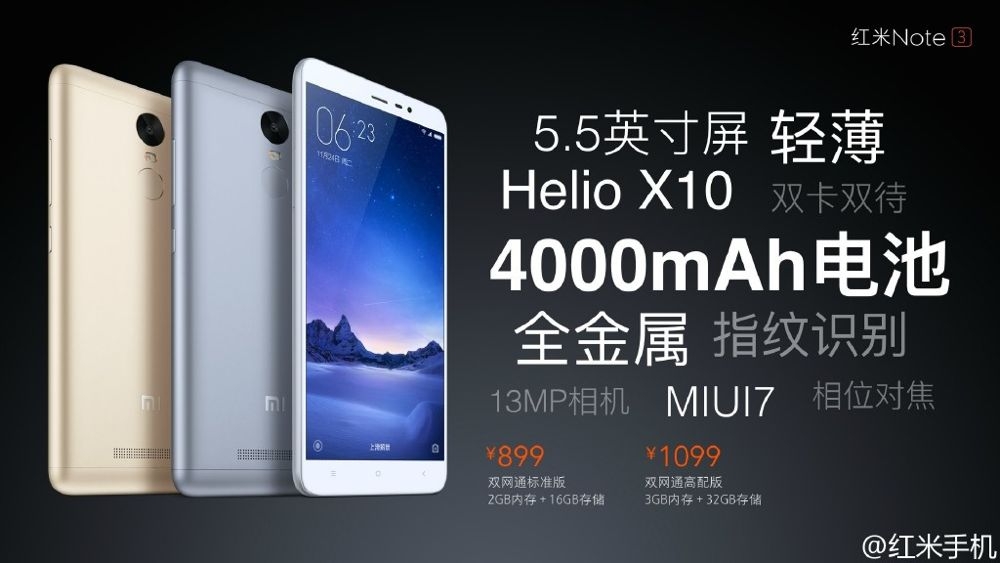 紅米 Note 3 是小米的第一款全金屬手機,5.5 吋的螢幕、 MTK Helio X10 八核心處理器、 1300 萬畫素相機鏡頭、500 萬畫素自拍鏡頭、2GB RAM 16GB ROM / 3GBRAM 32GB ROM,4000mAh 電池容量,支援 4G 雙卡雙待、 5 組指紋辨識與紅外線遙控。