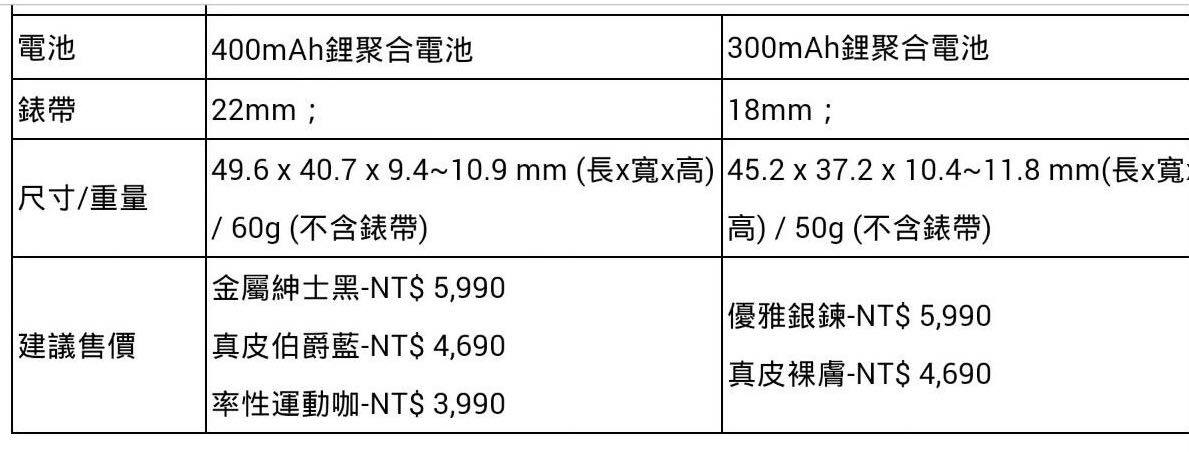 另一個也是注目商品的 ZenWatch 2 同樣在今天公佈售價資訊,分為 300mAh 電池容量 / 18mm 錶帶款與 400mAh 電池容量/ 22mm 錶帶款兩種,售價則是分別為 NT$4,690 起與 NT$3,990 起共五種搭配選擇。