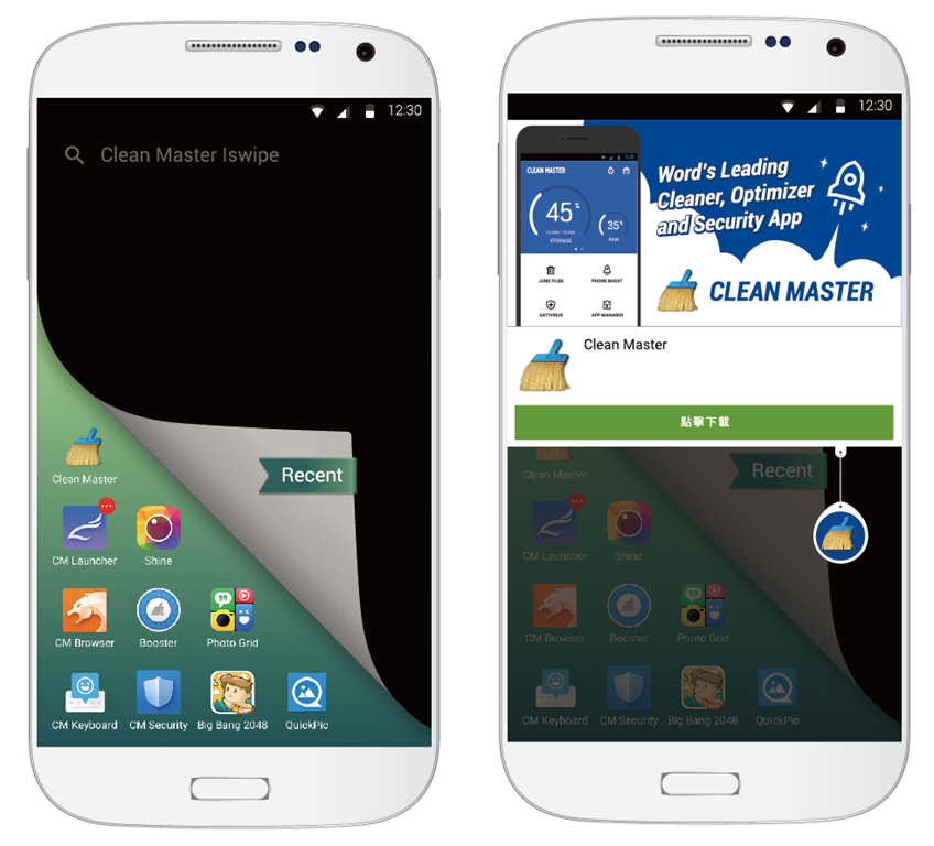 Clean Master全新功能,讓用戶在使用單一應用時,不需返回手機桌面查找App,只需從螢幕的左下角或右下角輕輕一劃,就可點選常用App和功能按鈕,還可查看收到的新訊息、查找最近使用過的App等,用戶使用手機更便捷。