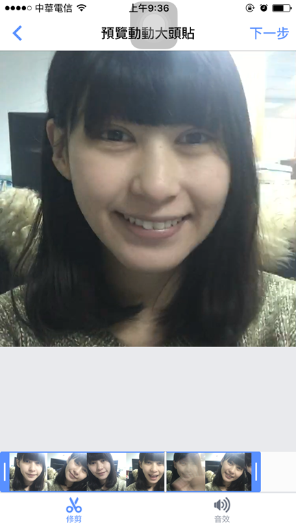 拍完之後就會出現剛剛錄好的影片,如果覺得太長可以選擇修剪!下面整條藍色都是剛剛錄的影片,想要修剪就從前後的藍色線動手拉,拉到你最滿意的片段!