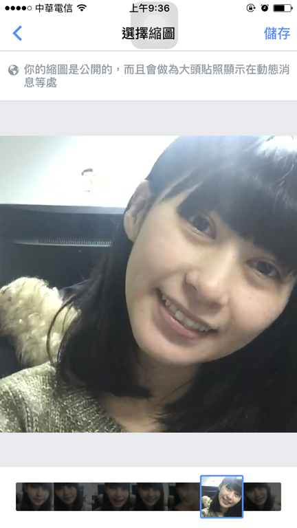 最後一個步驟就是可以選擇縮圖!相信很多人拍完影片看到縮圖都會倒退三步,不論是眨眼、翻白眼又或是臉歪嘴斜的截圖都很恐怖!於是這款動動大頭照也可以選擇縮圖,他會出現在你動態消息中!固定畫面的圖案也要讓人想點進去看你的動動大頭照啊!