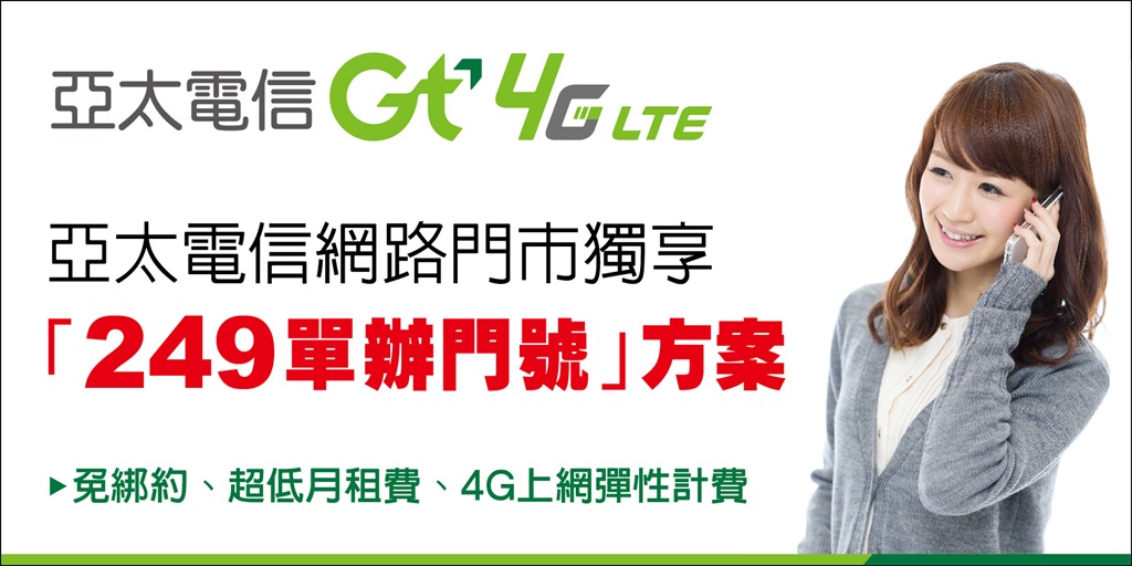 亞太電信為針對輕、中度行動上網需求的消費者,正式推出網路門市獨賣「249單辦門號」方案,主打「免綁約」、「超低月租」及「真正4G網路用量彈性計價」三大優惠,提供給消費者更多自由選擇;另外對於上網用量較大的消費者,即日起至12/31止,更推出申辦「指定4G手機方案,4G上網流量加倍送」的聖誕好禮!
