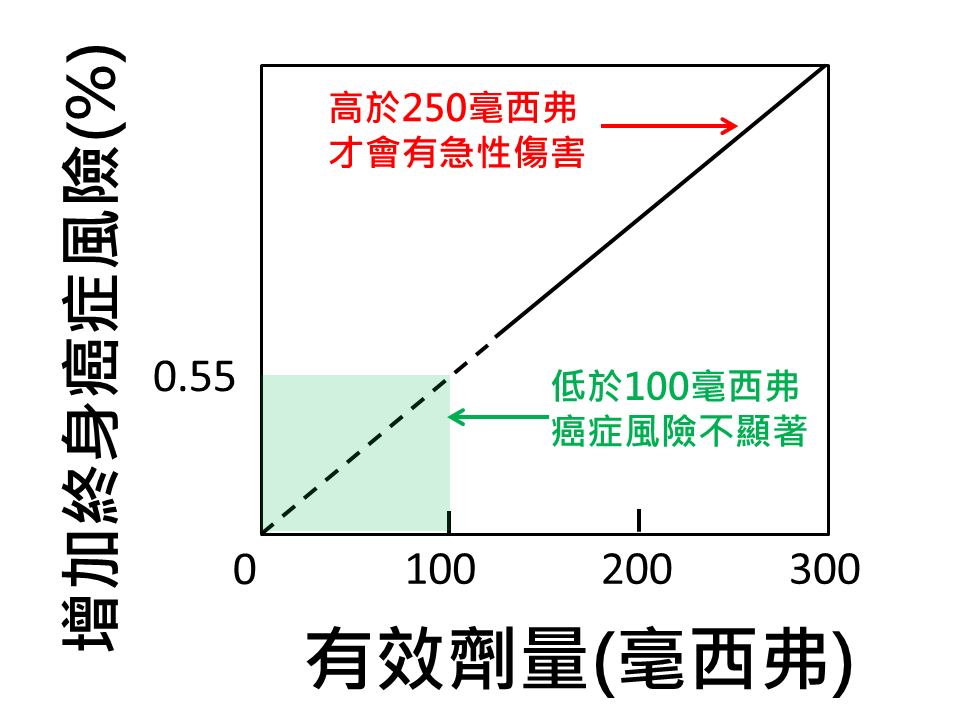 (線性無閾模型僅在輻射劑量大於125毫西弗時才有足夠證據顯示與癌症機率相關)