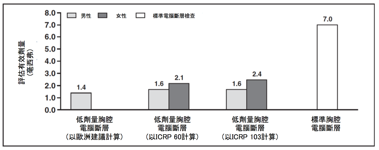 (美國普查低劑量胸腔電腦斷層檢查的劑量不分性別地遠低於100毫西弗,見參考資料6)