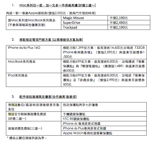 凡購買iPhone 6s/6s Plus 16G 搭配月租 1,399 型方案,除最高可省 NT$14,600 元外,再加碼送價值 NT$2,590 元的 32GB iPhone 專用隨身碟與1,000 元遠東禮券,現省超過 NT$18,000 元!其他如 MacBook 系列商品或 iPad 系列商品搭配網卡月租 699 型方案,不僅最高現省 NT$8,000 元,還加碼送螢幕保護貼搭配 Macbook 電腦包或 iPad 原廠皮套與 500 元遠東禮券。