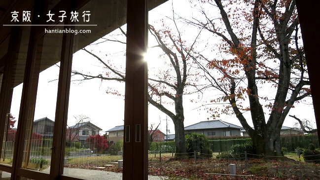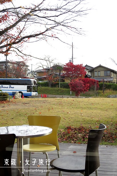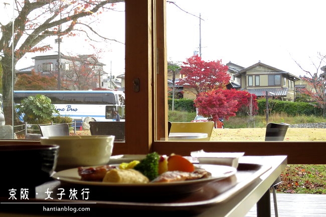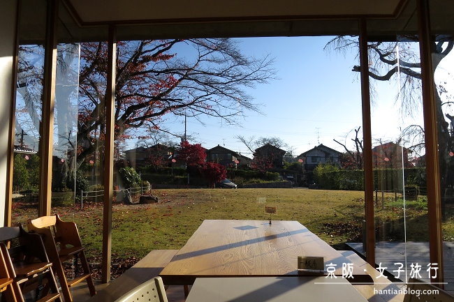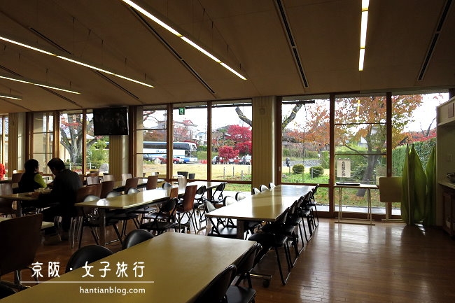食堂整片的落地窗,可以看到宇多野青年旅館前的庭院美景