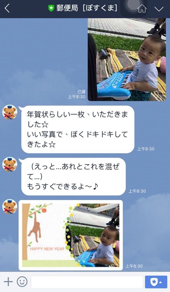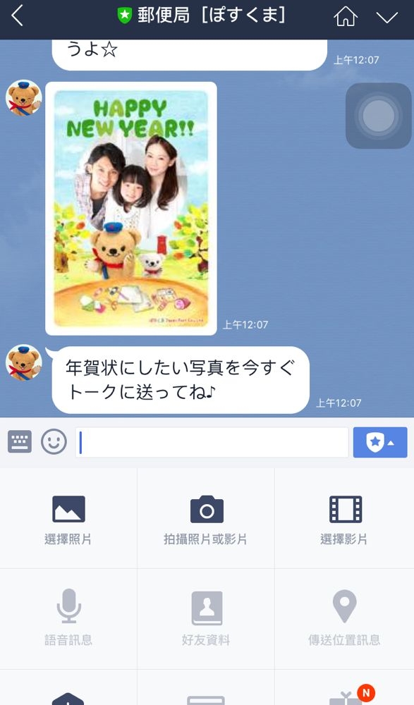 原來只要加入日本郵便局也就是郵局的官方帳號為好友,你就能在訊息處挑選一張照片傳送,接著等上 5-10 秒的時間,他們就會為你隨機套版製作出別有風格的新年賀卡回傳給你!